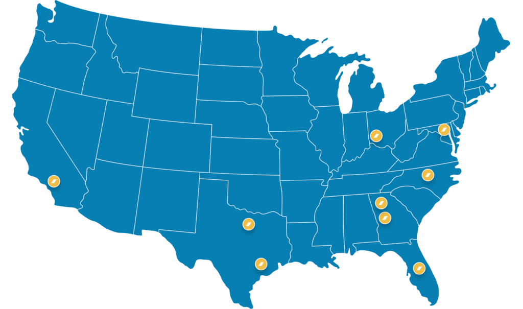 We have locations in downtown Atlanta, GA and Rancho Cucamonga, CA.