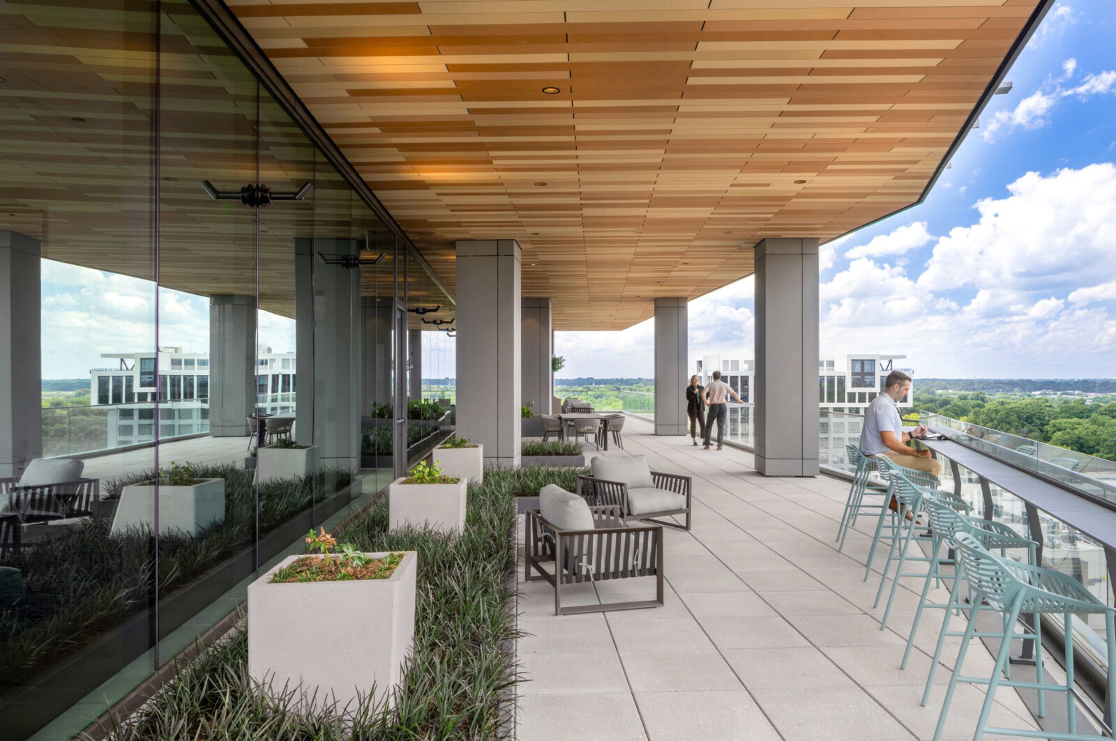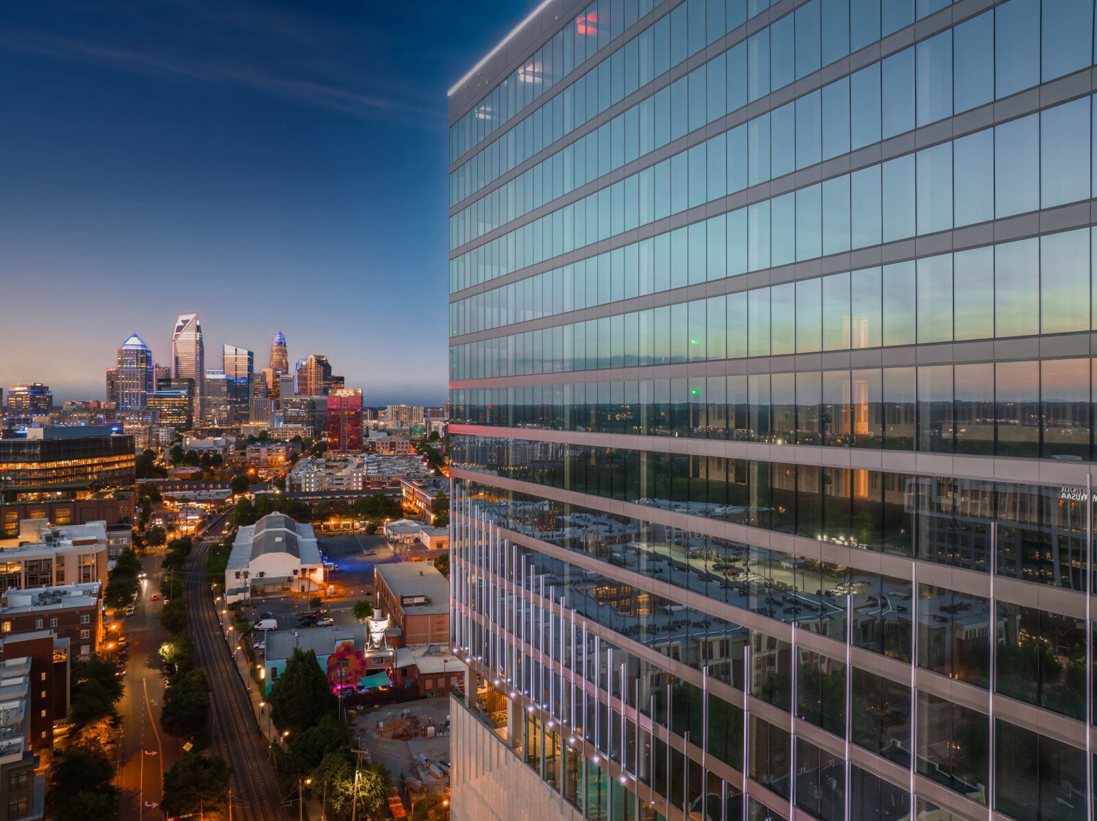 At street level, expansive clear glass opens the building to the public realm, blurring the line between inside and out. This creates an inviting streetscape that engages with nearby public spaces, a mural, and the LYNX light rail, fostering connectivity and vibrancy.